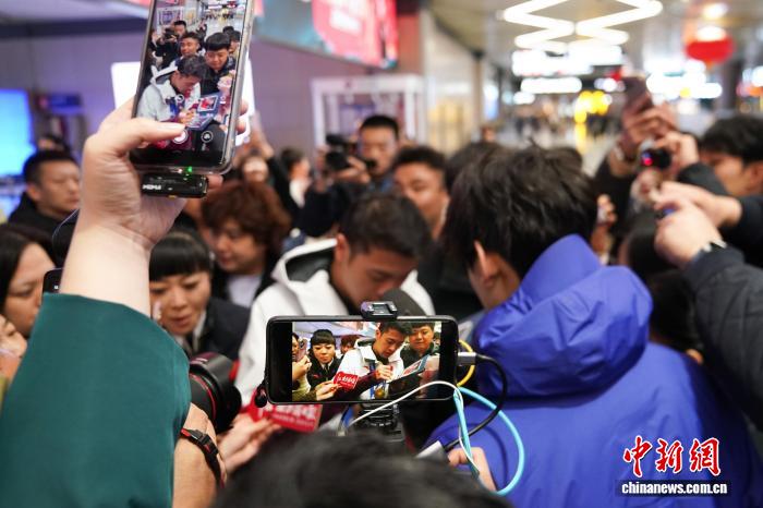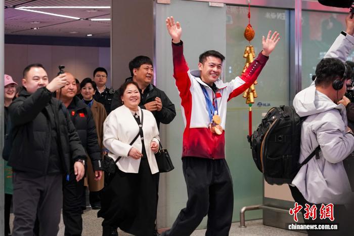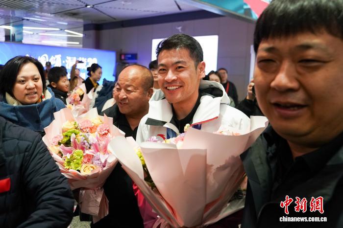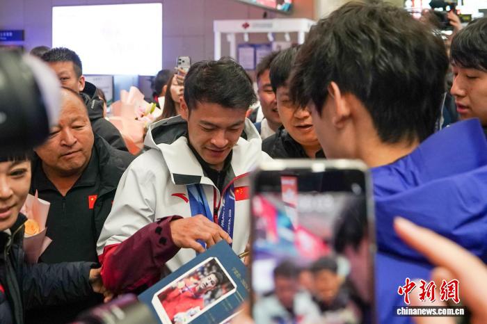 图为华夏快度溜冰疏通员宁忠岩佩带3枚奖牌取年夜家挨号召。赵宇航 摄